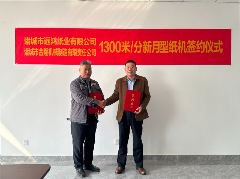 2025 年 3 月諸城市金隆機(jī)械有限責(zé)任公司與諸城遠(yuǎn)鴻紙業(yè)有限公司在金隆機(jī)械總部舉行戰(zhàn)略合作簽約儀式,雙方就 2850 新月型高速衛(wèi)生紙機(jī)項目達(dá)成深度合作意向。本次簽約標(biāo)志著雙方在造紙裝備智能化升級領(lǐng)域邁出關(guān)鍵一步,將共同推動行業(yè)綠色高質(zhì)量發(fā)展。